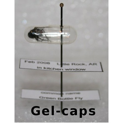 Gel-caps are great for temporary or long-term protection of dried insect specimens. The capsule can be easily opened and specimen removed for close observation. The specimen can also be viewed within the clear capsule and the capsule can be pinned as shown in the above picture..